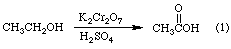 The reaction shown in Equation 1 is used by law enforcement agencies to test for OUI violations. During a "Breathalyzer" test, the person suspected of operating under the influence of alcohol exhales into a tube leading into a solution of potassium dichromate in sulfuric acid. The chromic acid oxidizes any alcohol to acetic acid. Oxidation of the alcohol is accompanied by reduction of the chromium from the +6 to the +3 oxidation level, a change that is accompanied by a change in color; Cr6+ is reddish-orange, while Cr3+ is blue-green. The greater the alcohol concentration in the suspect's breath, the greater the color change, which is measured quantitively with a small spectrophotometer that is part of the "Breathalyzer" apparatus.