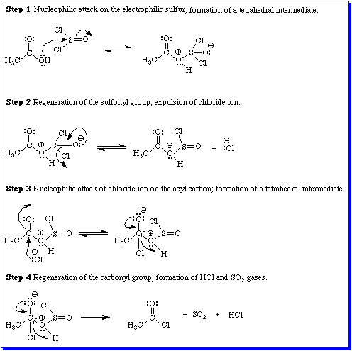 Carboxylic acids react with chlorinating agents such as thionyl chloride, SOCl2, and phosphorous trichloride, PCl3, to produce the corresponding acid chloride. Thionyl chloride and phosphorous trichloride are electrophilic reagents. (Why?) Figure 6 outlines a mechanism that rationalizes the formation of acetyl chloride from the reaction of acetic acid with thionyl chloride.